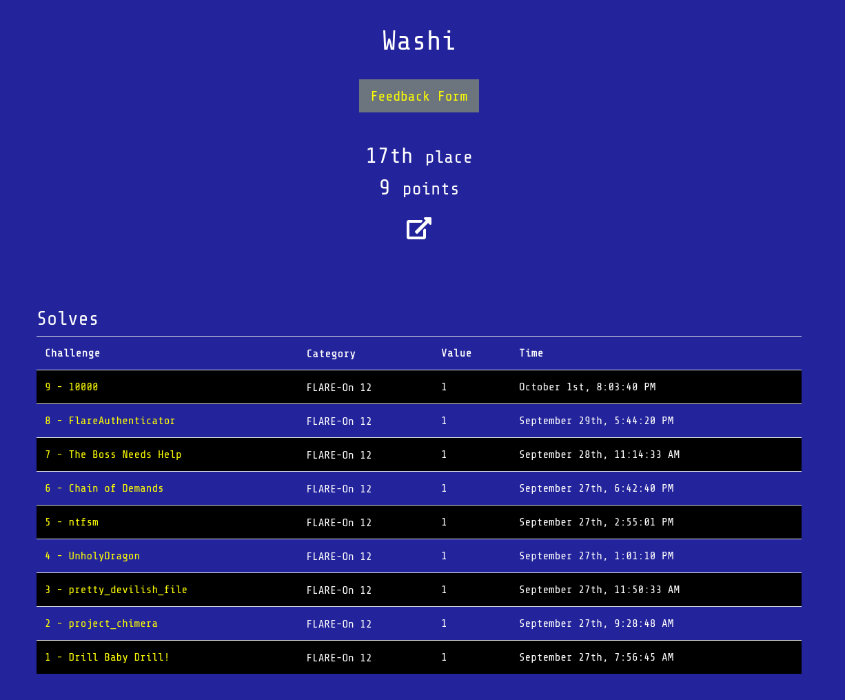 My only main complaint: I wish there were more realistic/malware related challenges. This year felt very CTF-y :^).