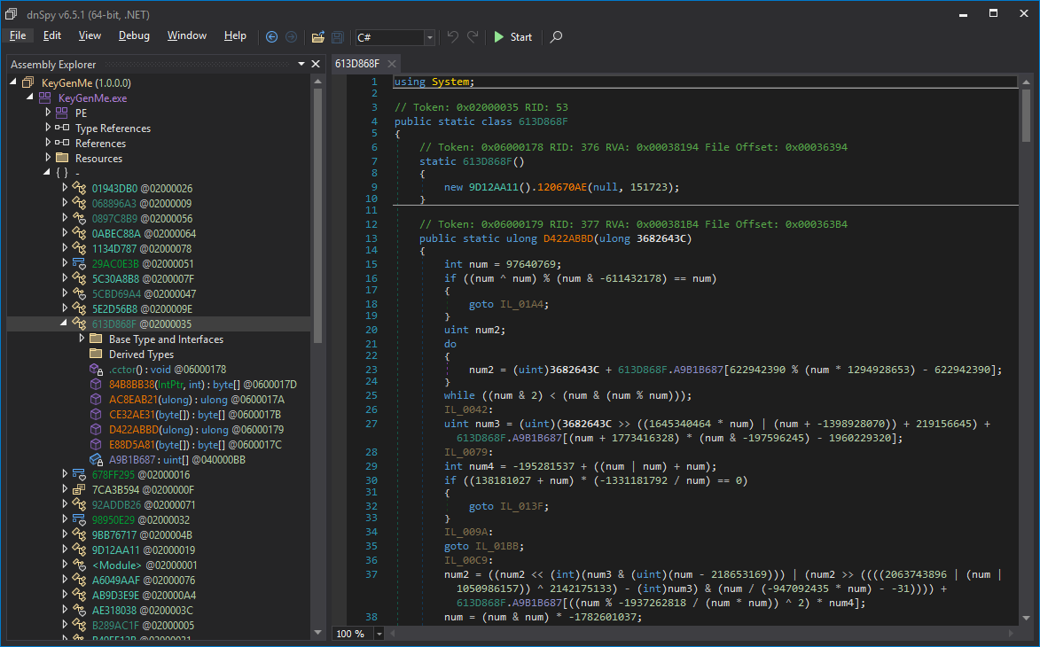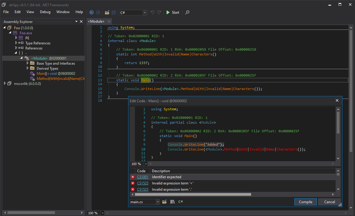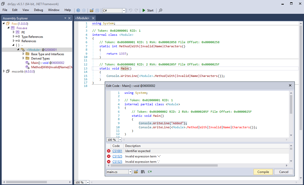 The C# editor heavily relies on the correctness of the decompiler output. Don’t get me wrong, ILSpy’s engine is great and dnSpy does a great job using it, but decompilation remains an imperfect process. Especially with obfuscation at play, a decompiler is very likely to not produce 100% correct or semantically equivalent code. Even if you changed nothing in the decompiled code and you hit compile, you are not guaranteed to have the same behavior as the original method. Furthermore, the feature has been the source of many unpredictable side-effects and/or bugs throughout the years (e.g., #177, #277, #278, #395, #441, #444, #460, #468), making it a pain to use. This is not really dnSpy’s fault; it is just an inherent limitation of any decompilation-based code editing.