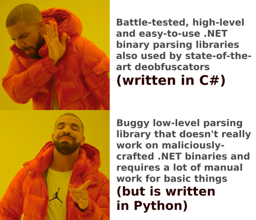 I have seen a lot of people in infosec that fall into this trap, particularly people that only know Python. For better or worse, the reverse engineering world primarily runs on Python, and as such, there are a good number of Python libraries that implement some form of .NET binary parsing (e.g., dnfile, dncil, dotnetfile…).